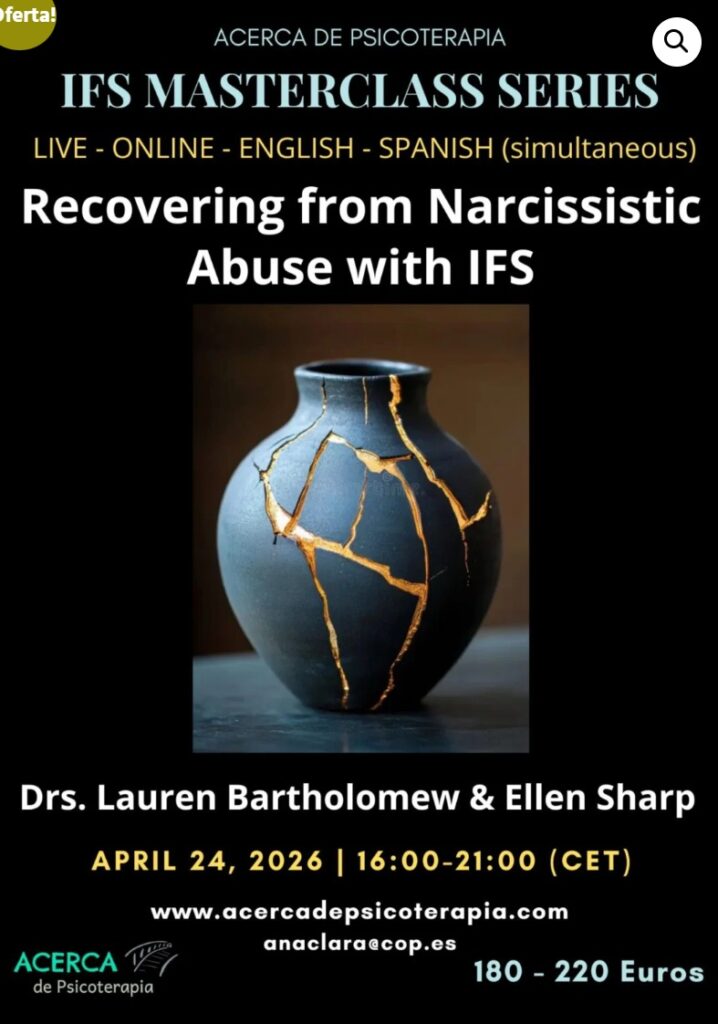 On April 24, 2026 (10 AM-3 PM EST), Dr. Lauren Bartolomew and I are thrilled to offer a revised and expanded version of our workshop on using IFS to Heal from Narcissistic Abuse online through Acerca de Psicoterapia in Madrid. We will present our material in English and it will be simultaneously translated into Spanish for participants who choose that option. We always break up the information we share with experiential activities to keep you engaged and to allow you to connect around this isolating experience. Break out rooms and pair shares will be organized by language preference.